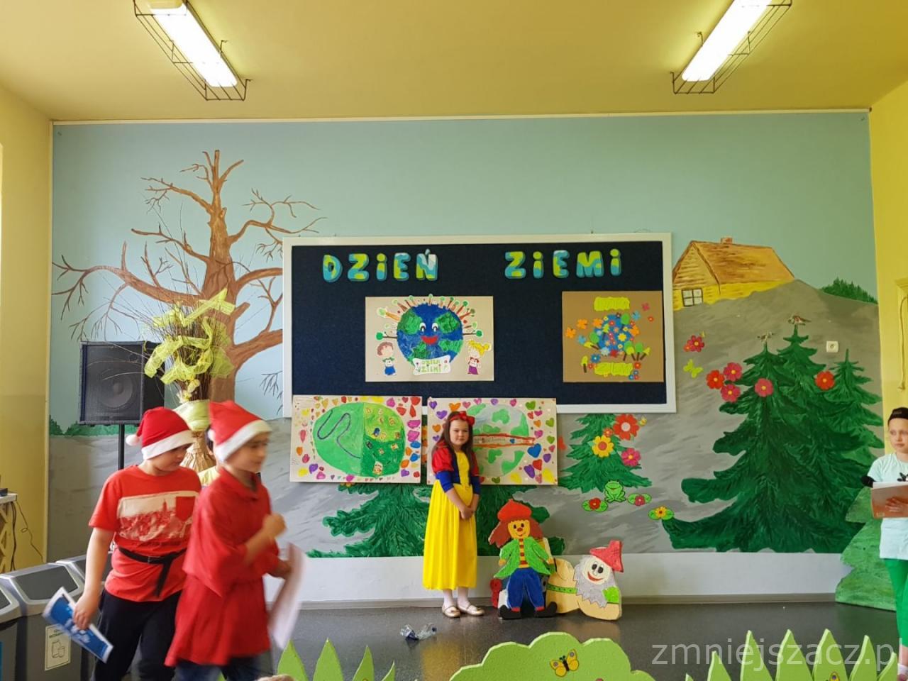 Dzieci w klasach wykonały plakaty, na których ukazały swoją troskę o środowisko naturalne. Wszyscy tego dnia ubrali się na zielono. Zwieńczeniem obchodów było przedstawienie przygotowana przez uczniów klasy III. Młodzi aktorzy wcielili się w postacie z bajek, które sprzątały las. Występ bardzo podobał się zebranej w sali publiczności, która nagrodziła popisy aktorów gromkimi brawami.