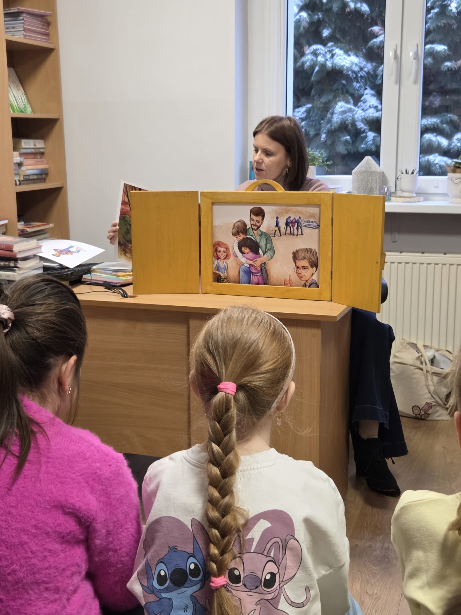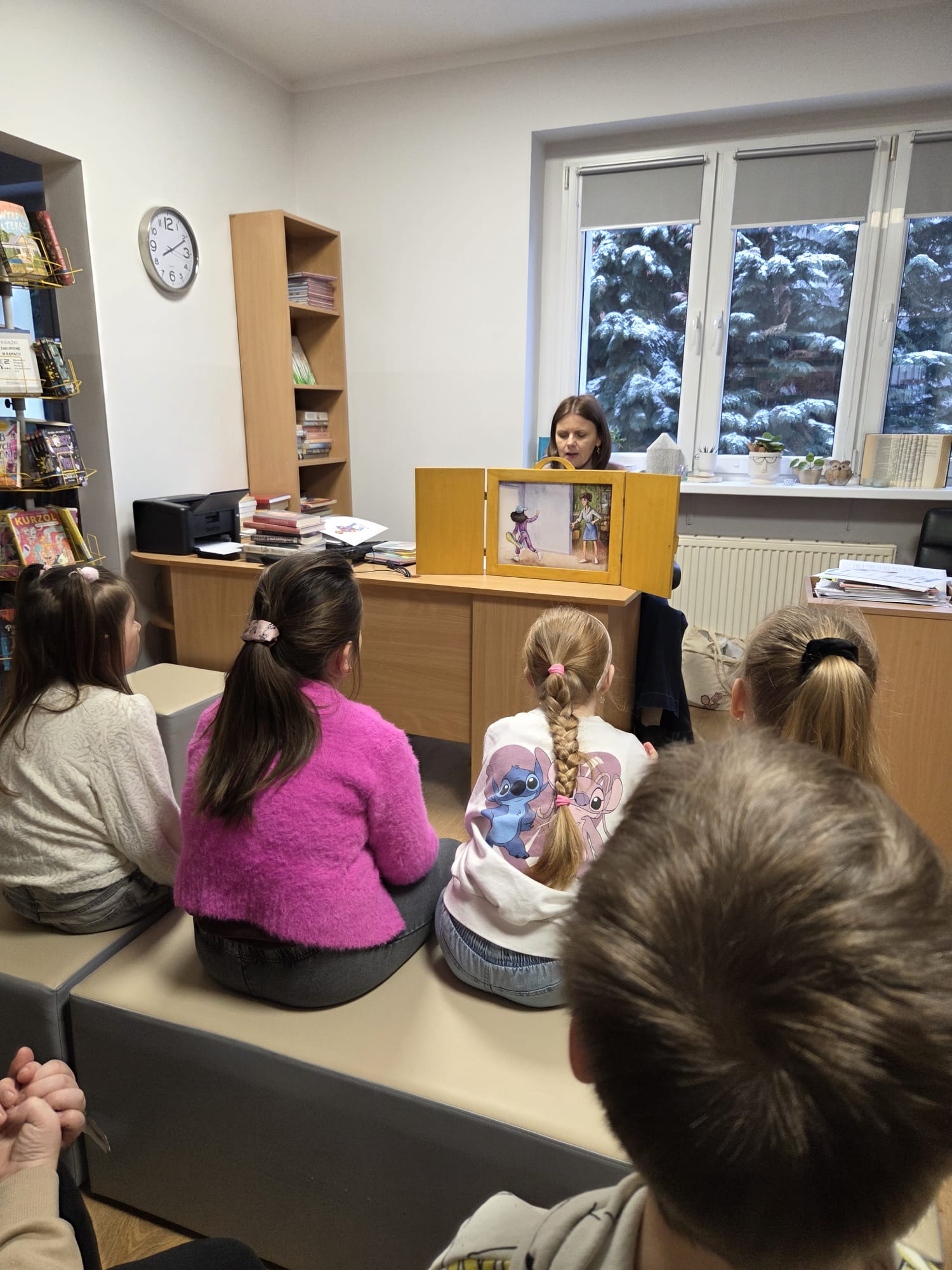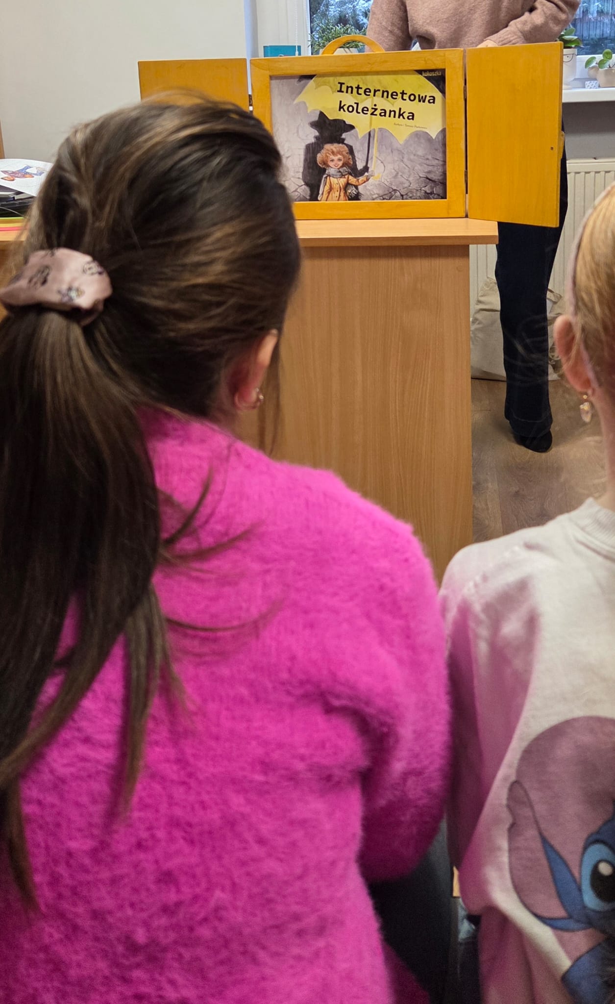 Punktem wyjścia do naszych rozmów był teatrzyk kamishibai – tradycyjna japońska sztuka opowiadania historii za pomocą ilustracji ukrytych w drewnianej skrzynce. Uczniowie wysłuchali opowiadania pt. „Internetowa koleżanka". Historia dziewczynki, która postanowiła spotkać się „w realu” z osobą poznaną w sieci, wywołała wiele emocji. Stała się ona idealnym pretekstem do rozmów na temat zalet i zagrożeń internetu.
