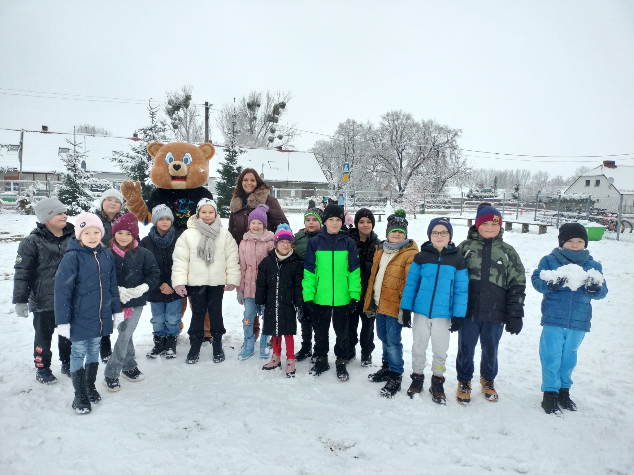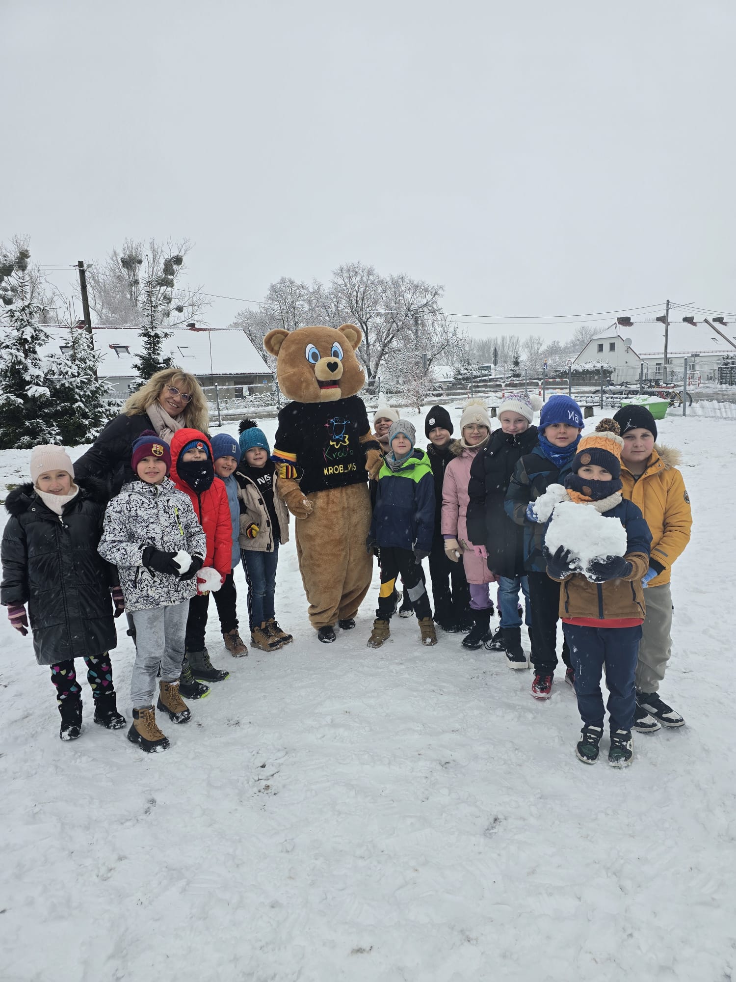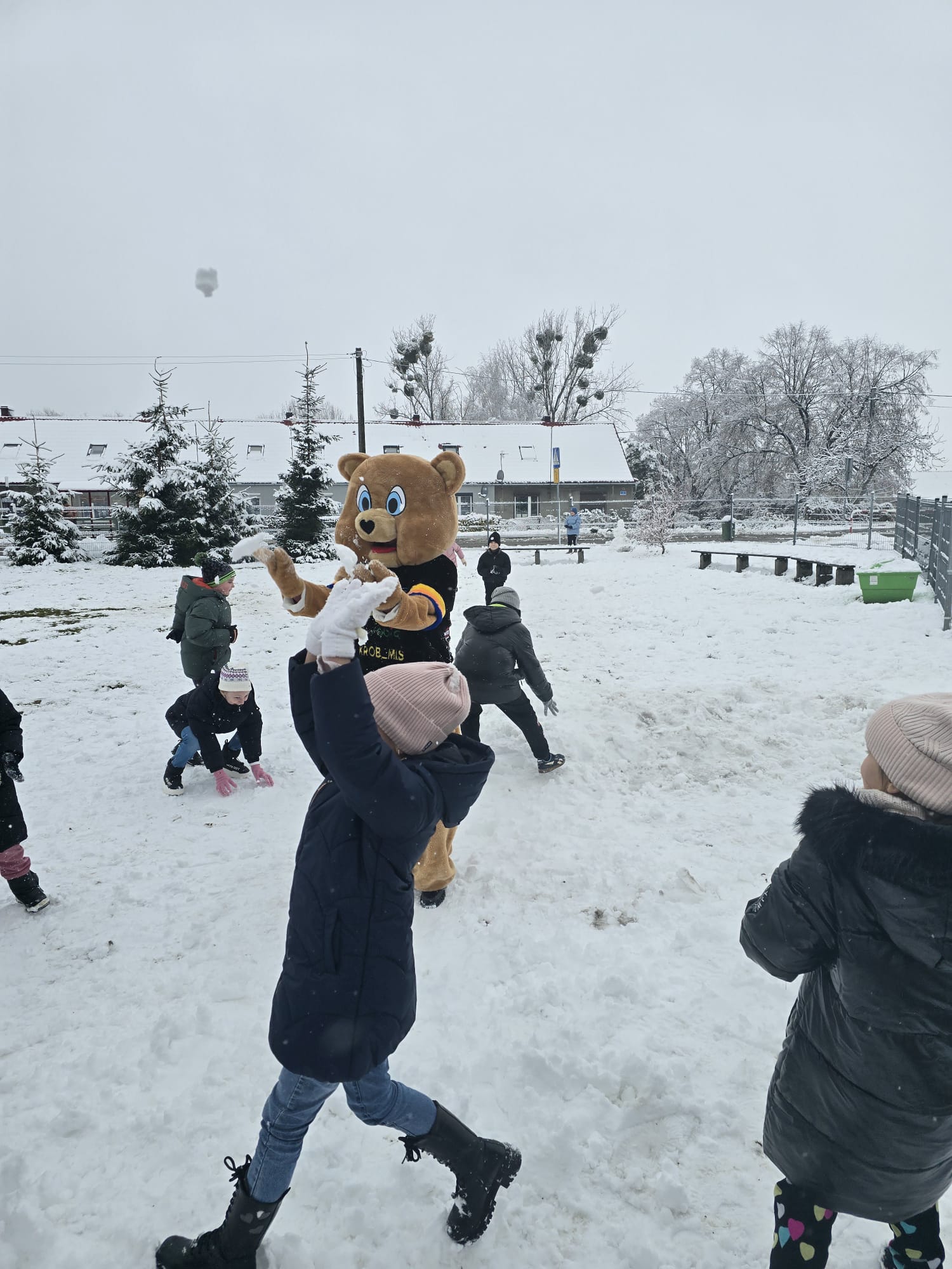 Zimowa aura wprowadziła wszystkich w doskonały nastrój, dlatego Krob-Miś chętnie dołączył do wspólnych zabaw na śniegu. Wspólne harce wywołały wiele śmiechu i stworzyły niezapomnianą atmosferę.