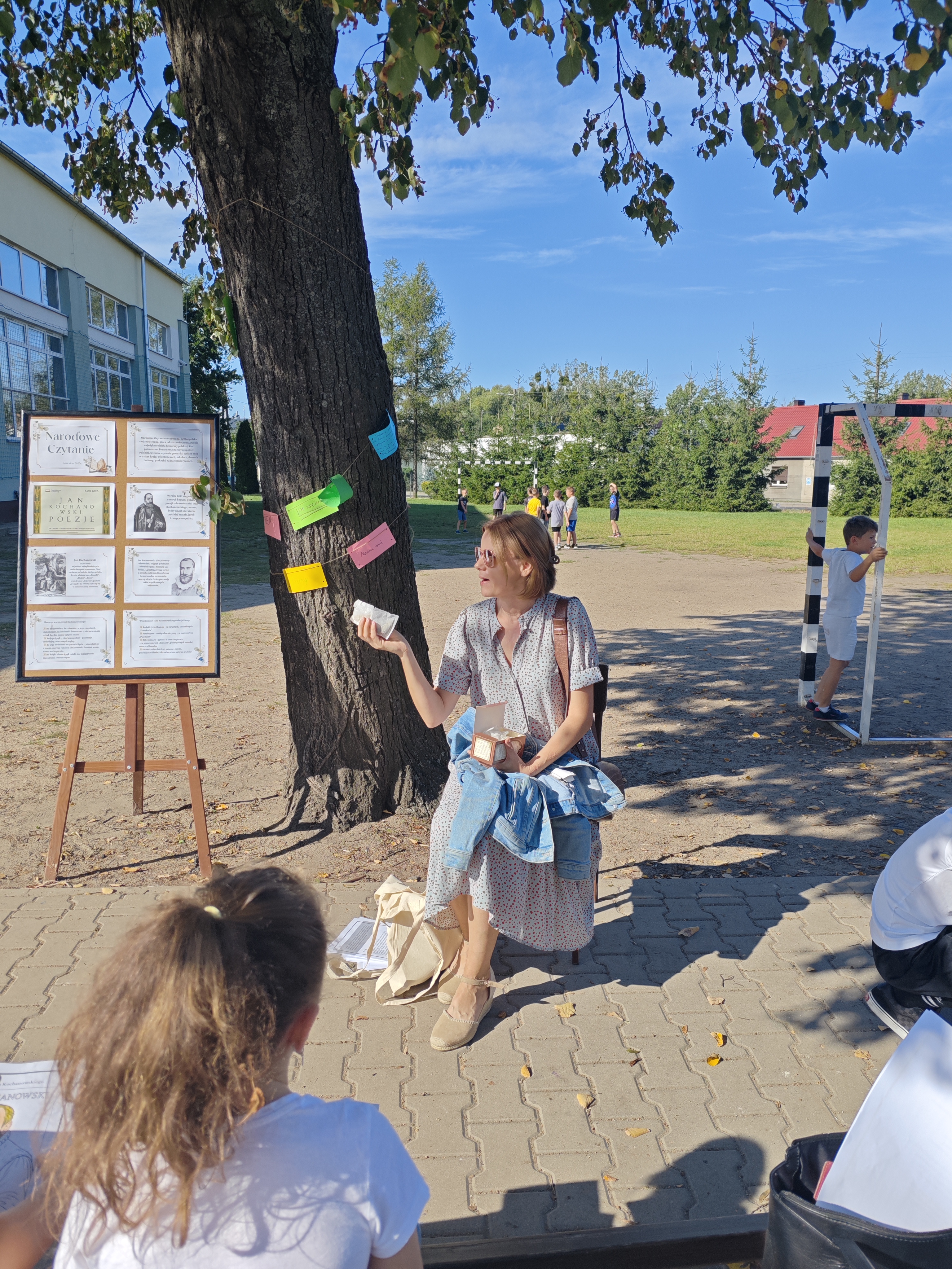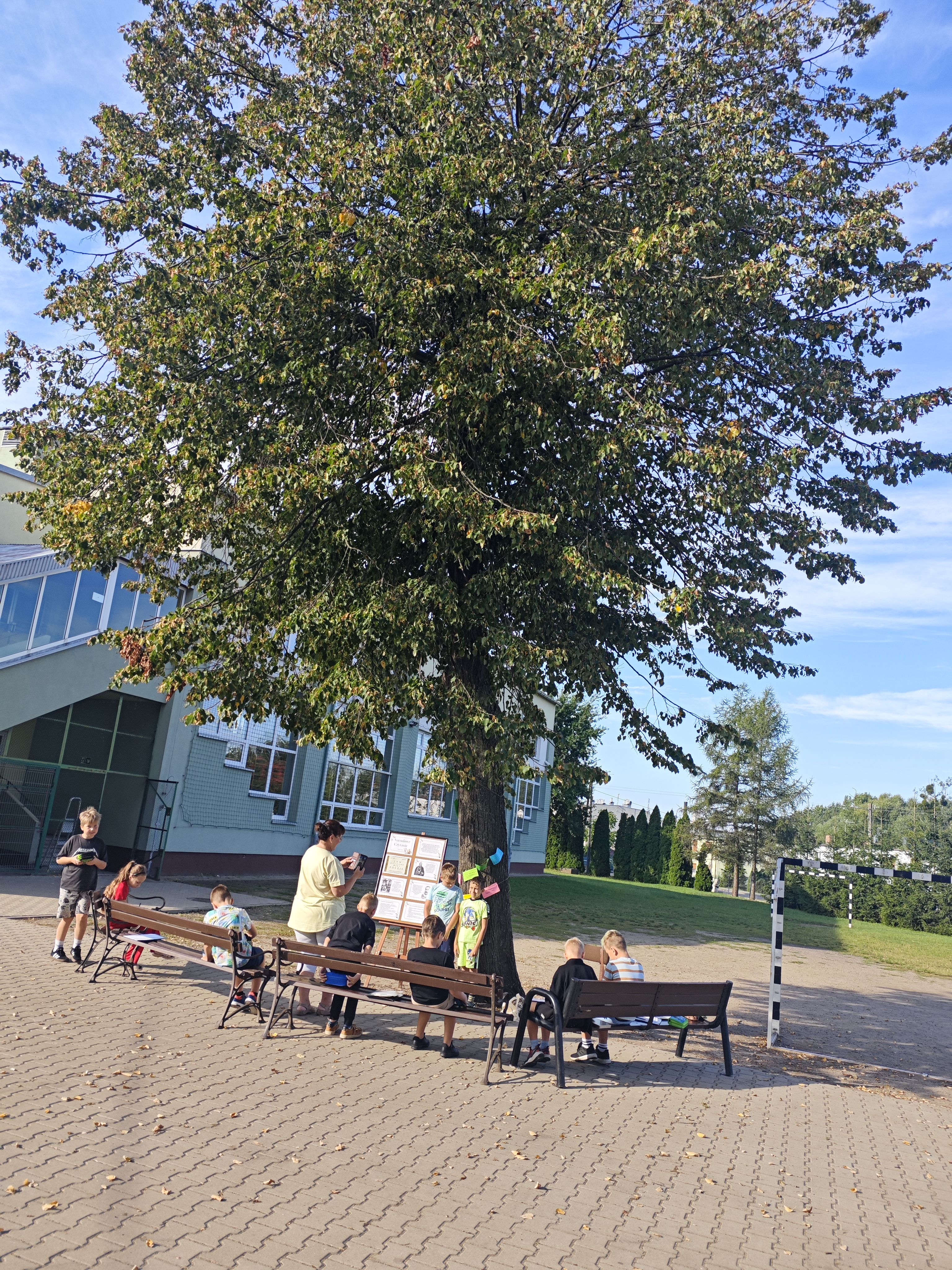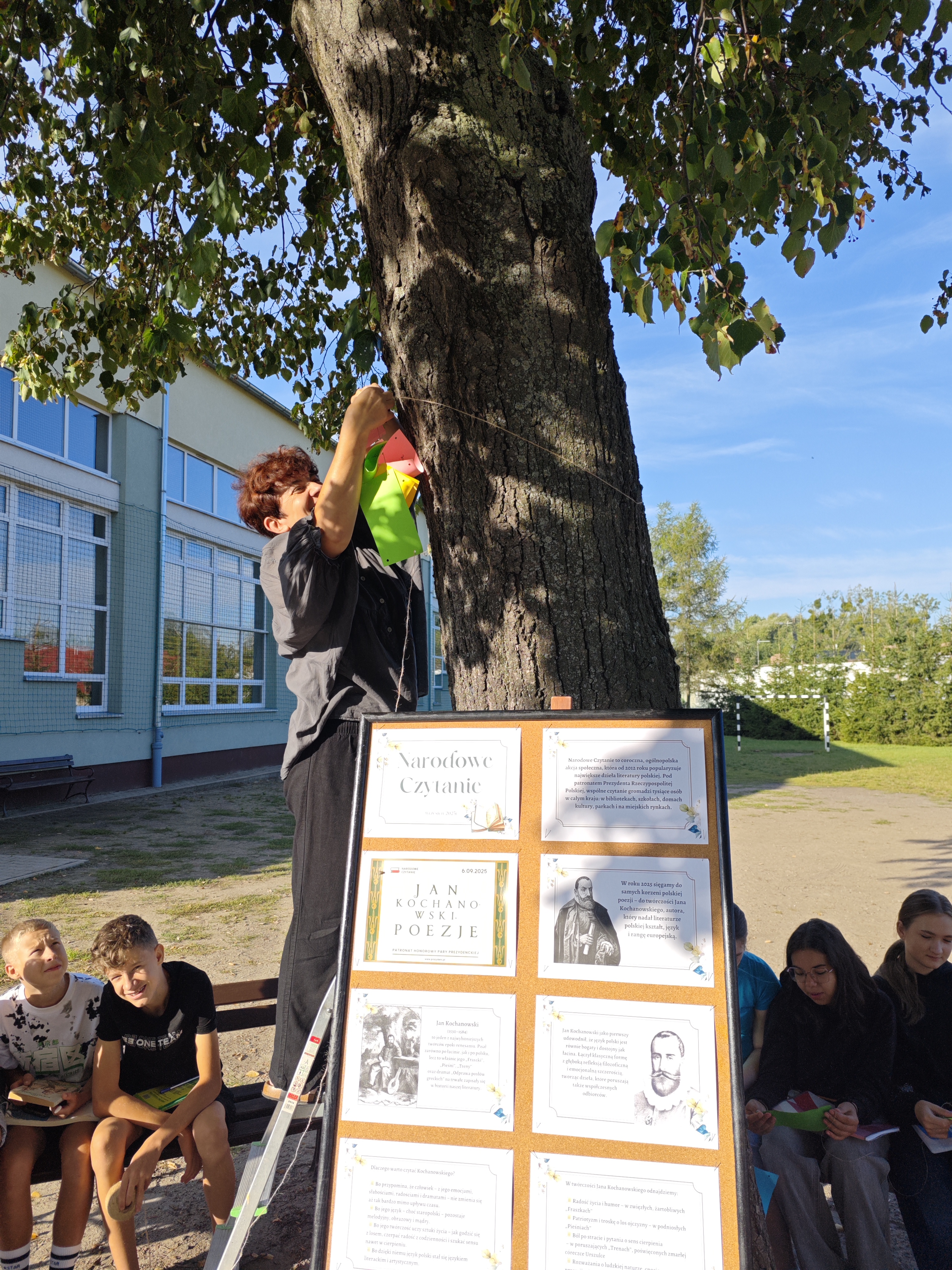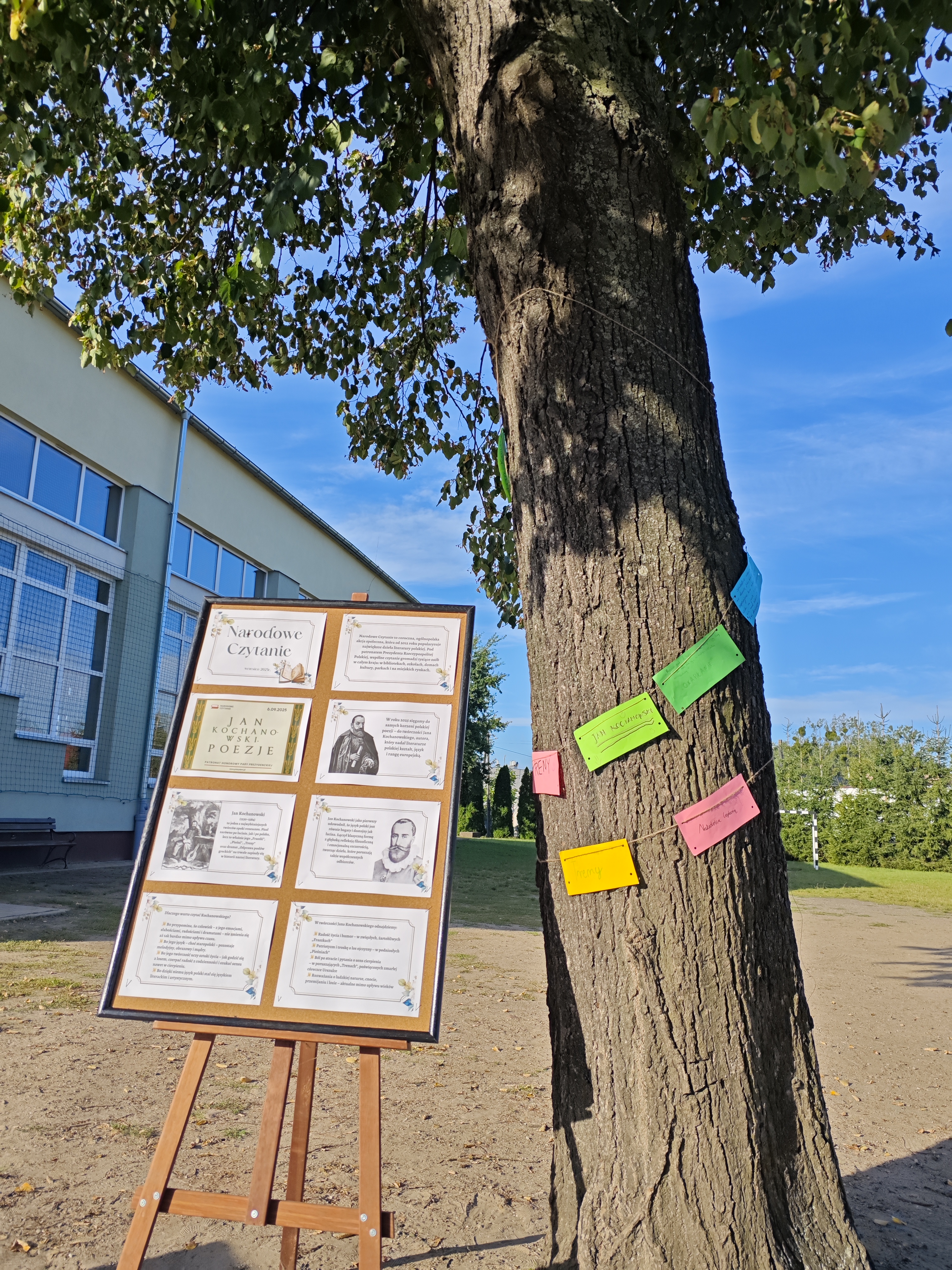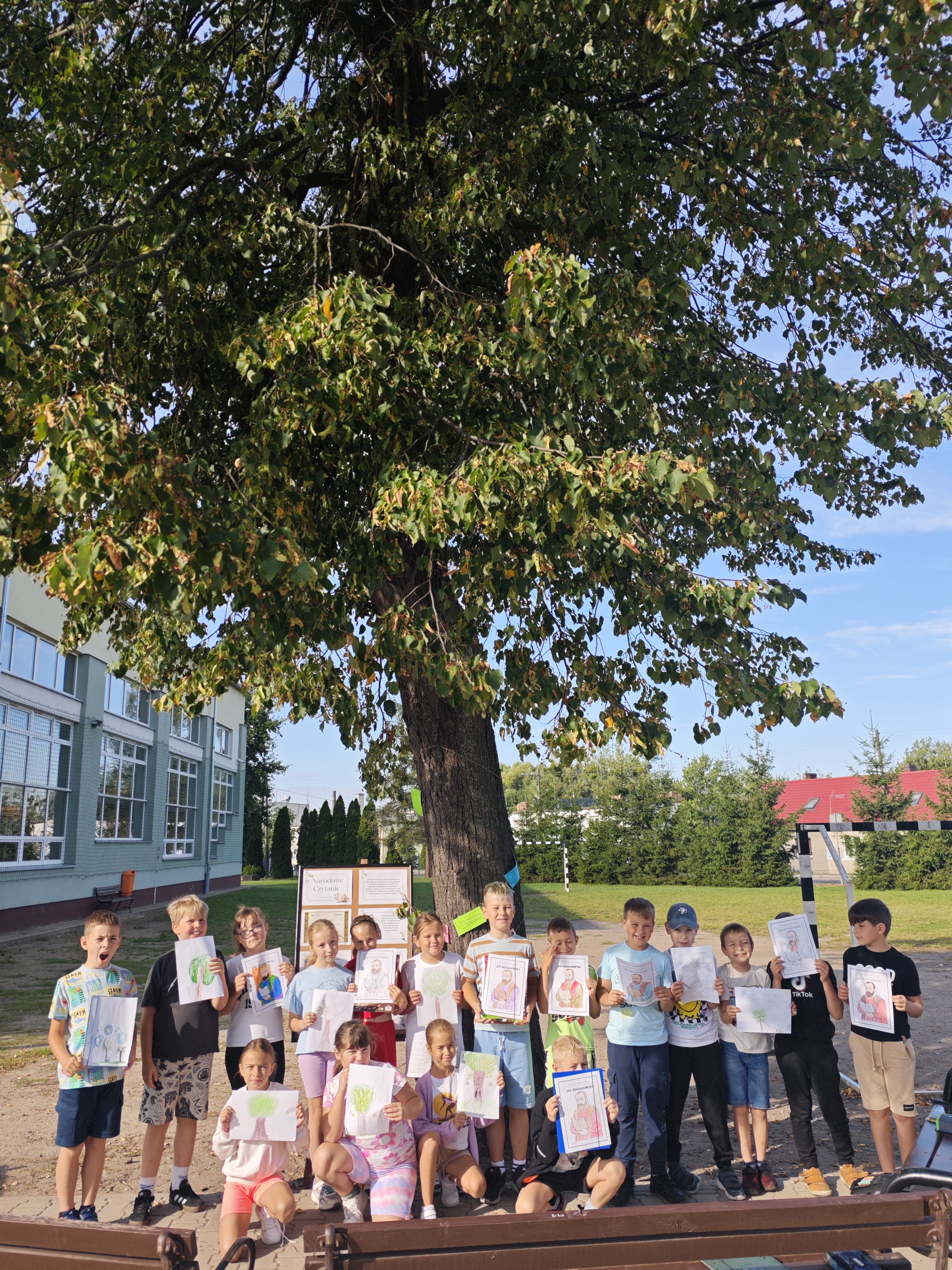 W sobotę w całej Polsce odbyła się kolejna edycja Narodowego Czytania – ogólnopolskiej akcji, której celem jest wspólne odkrywanie i promowanie polskiej literatury klasycznej. W tym roku sięgnęliśmy po utwory Jana Kochanowskiego – poety renesansu, który w lekkiej formie potrafił zawrzeć życiową mądrość, humor i refleksję nad światem. Nasze szkolne czytanie zorganizowaliśmy w piątek w wyjątkowej scenerii – na ławeczkach wokół lipy. Uczniowie i nauczyciele czytali utwory mistrza z Czarnolasu – nie tylko słynną fraszkę „Na lipę”. Młodsi uczniowie rysowali lipę i wskazywali jej zalety, a także kolorowali portret poety. Starsi m.in. zastanawiali się, jakie tematy mógłby dziś poruszyć Kochanowski w swoich wierszach.