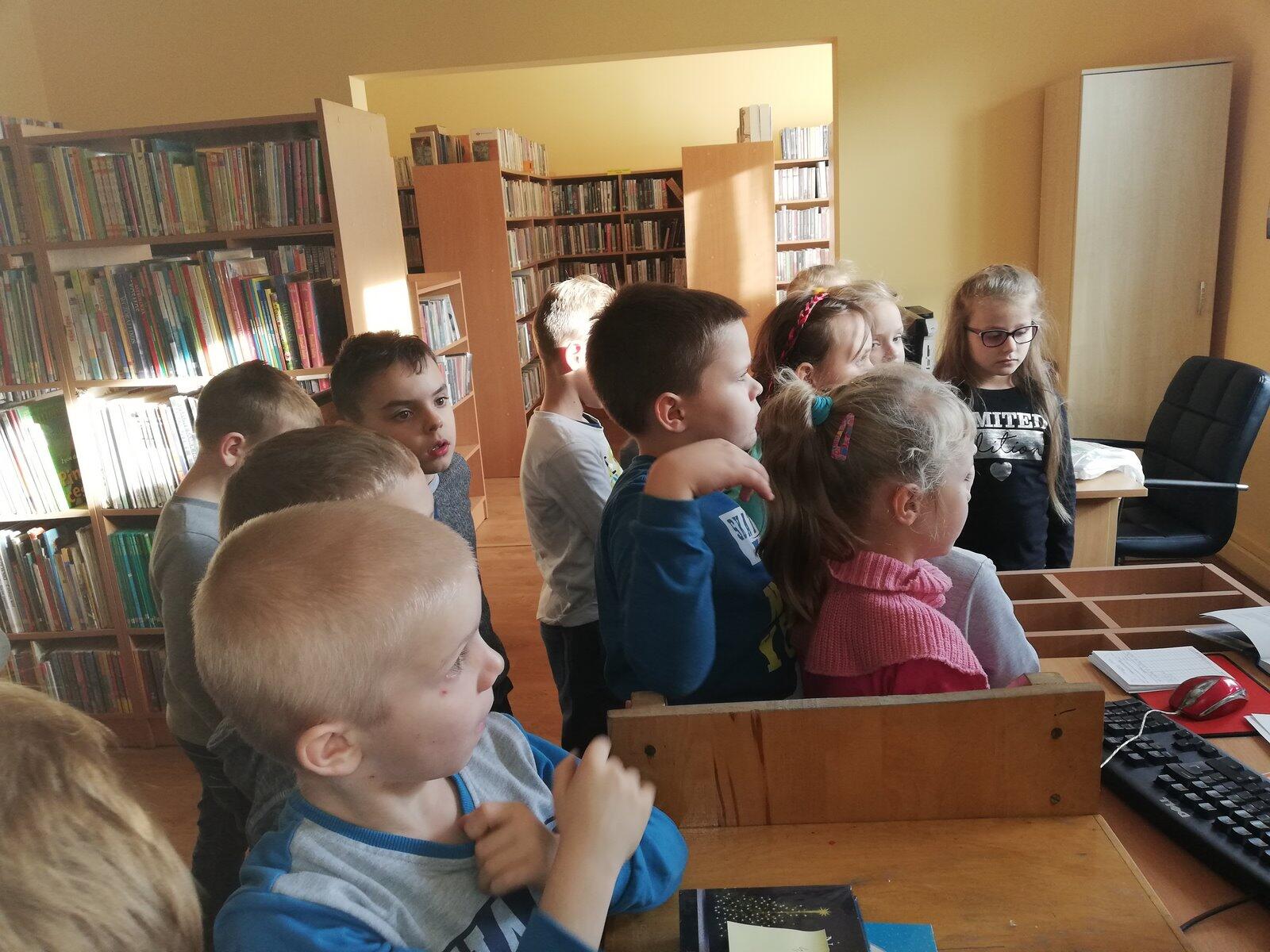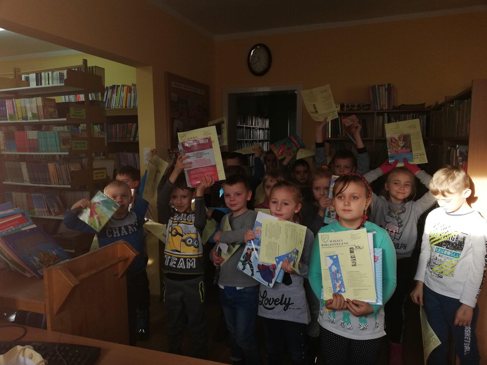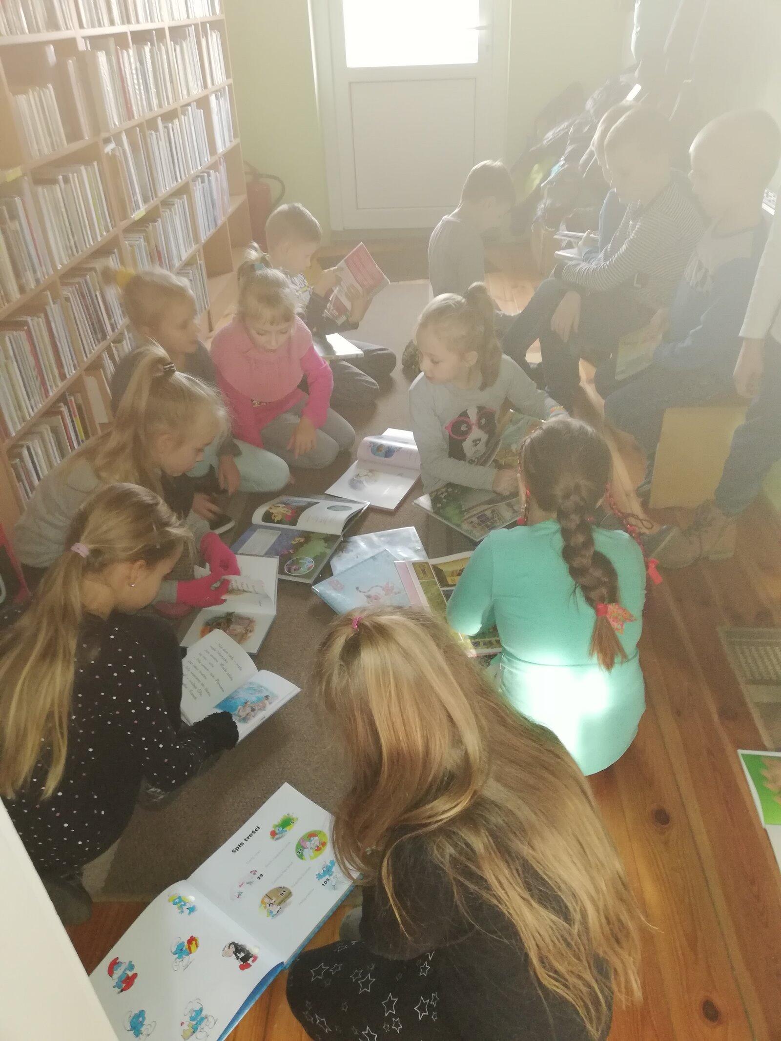 Uczniowie wyszli z biblioteki zadowoleni z książkami, które z ciekawością przeglądali w klasie.