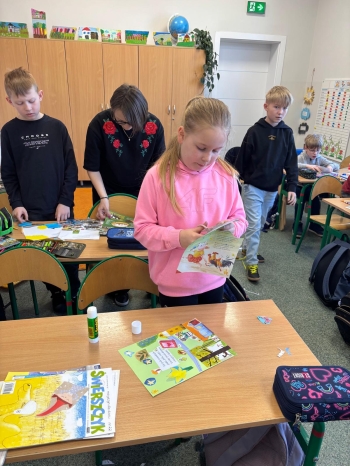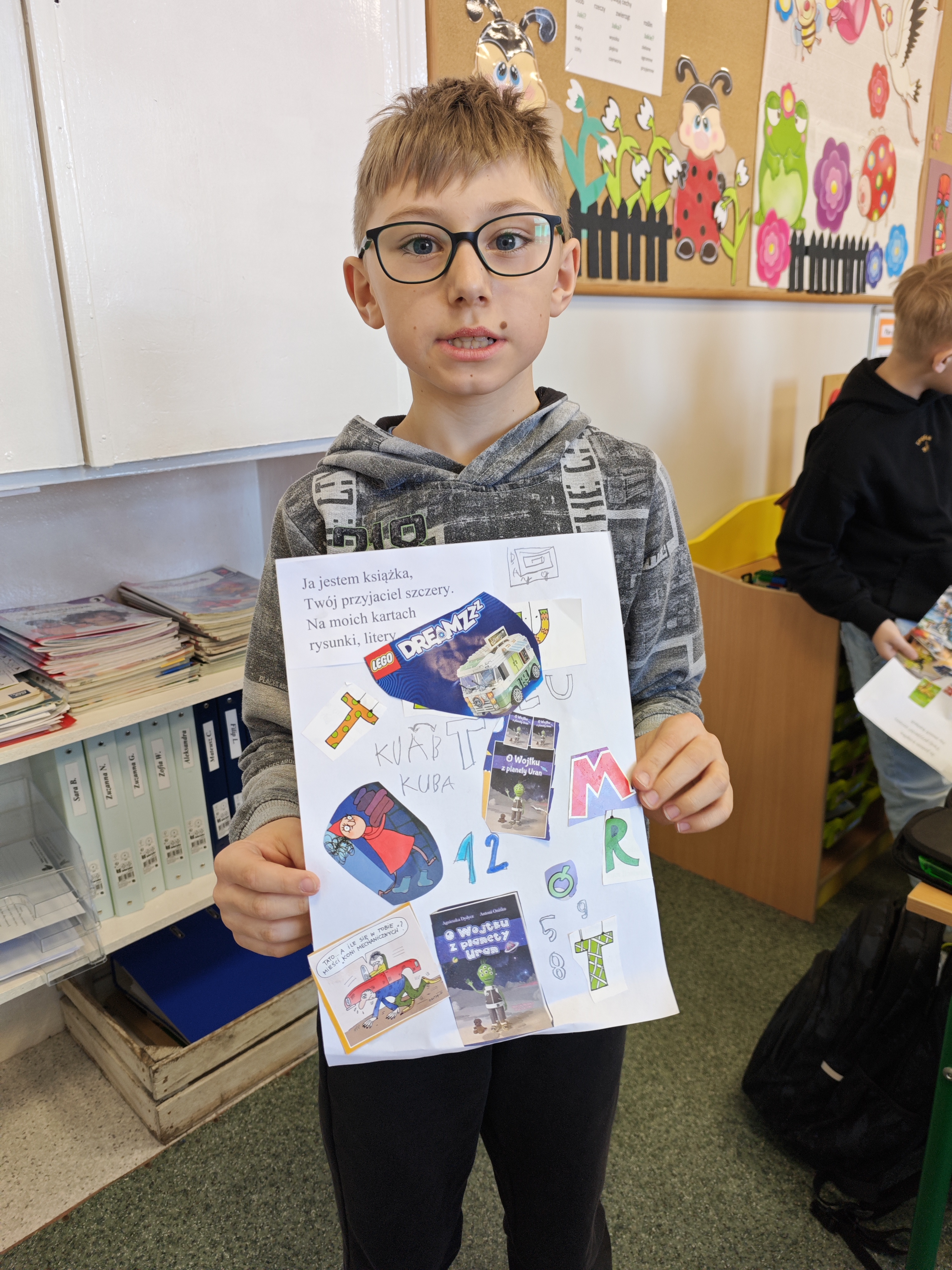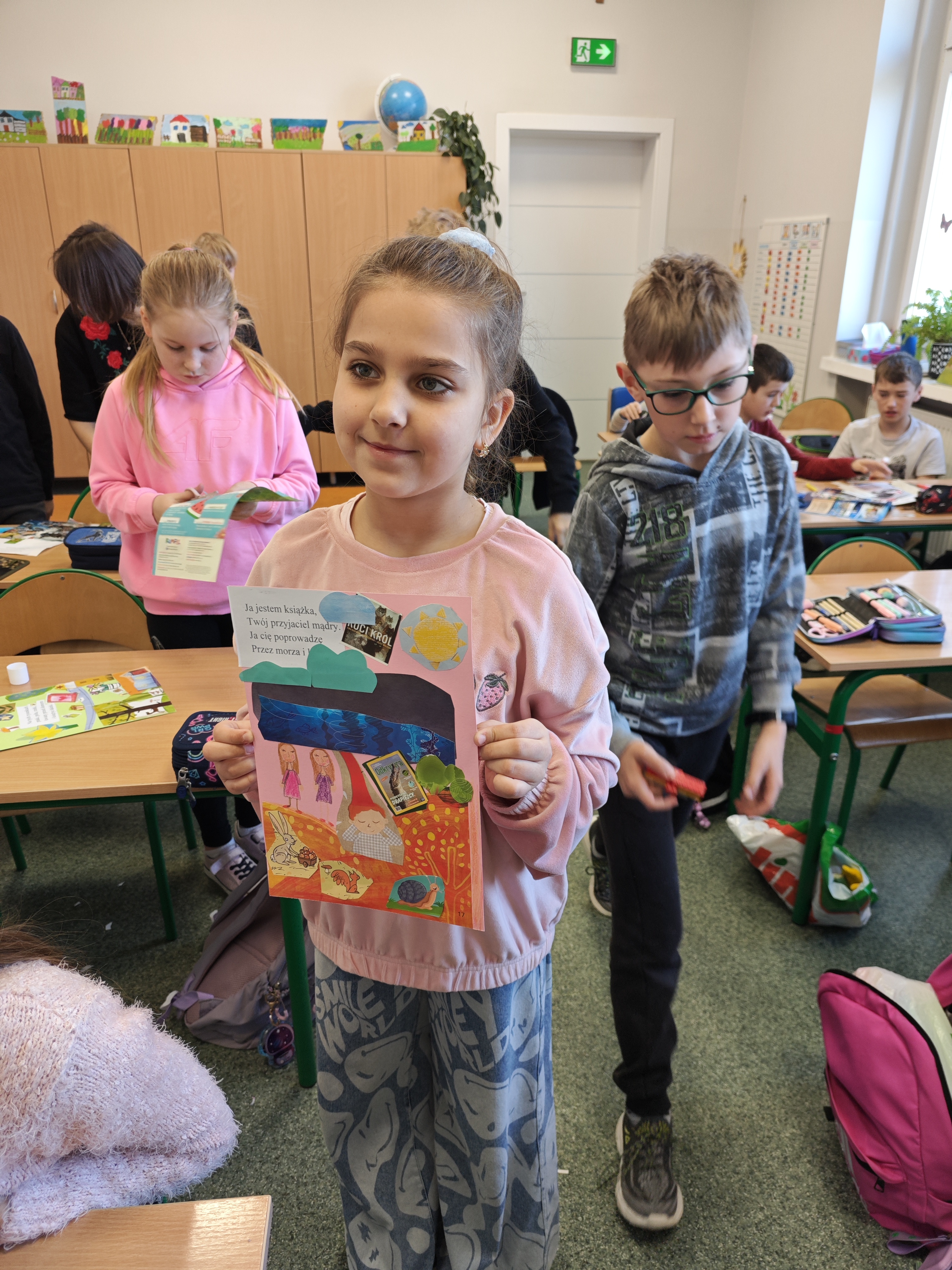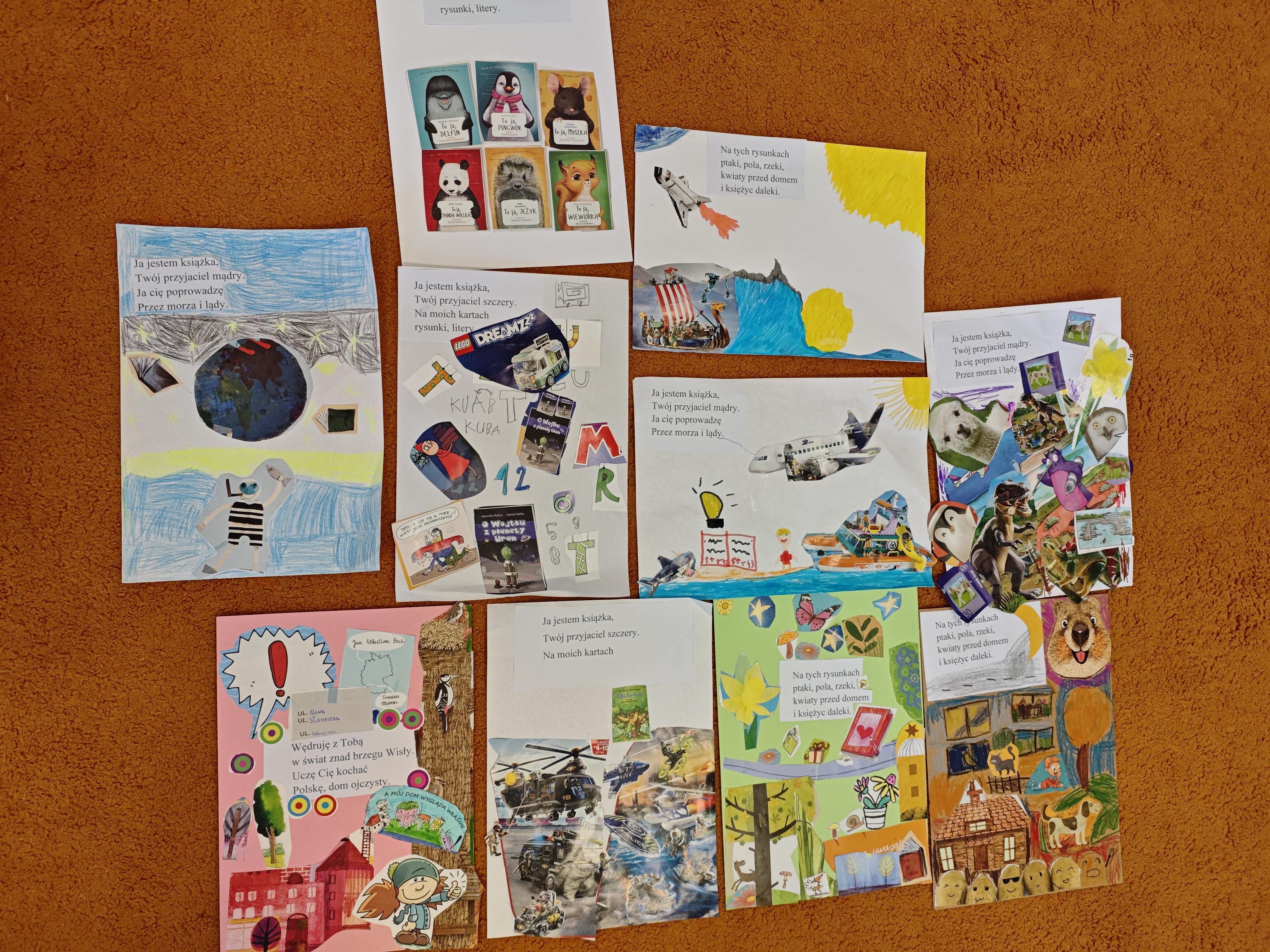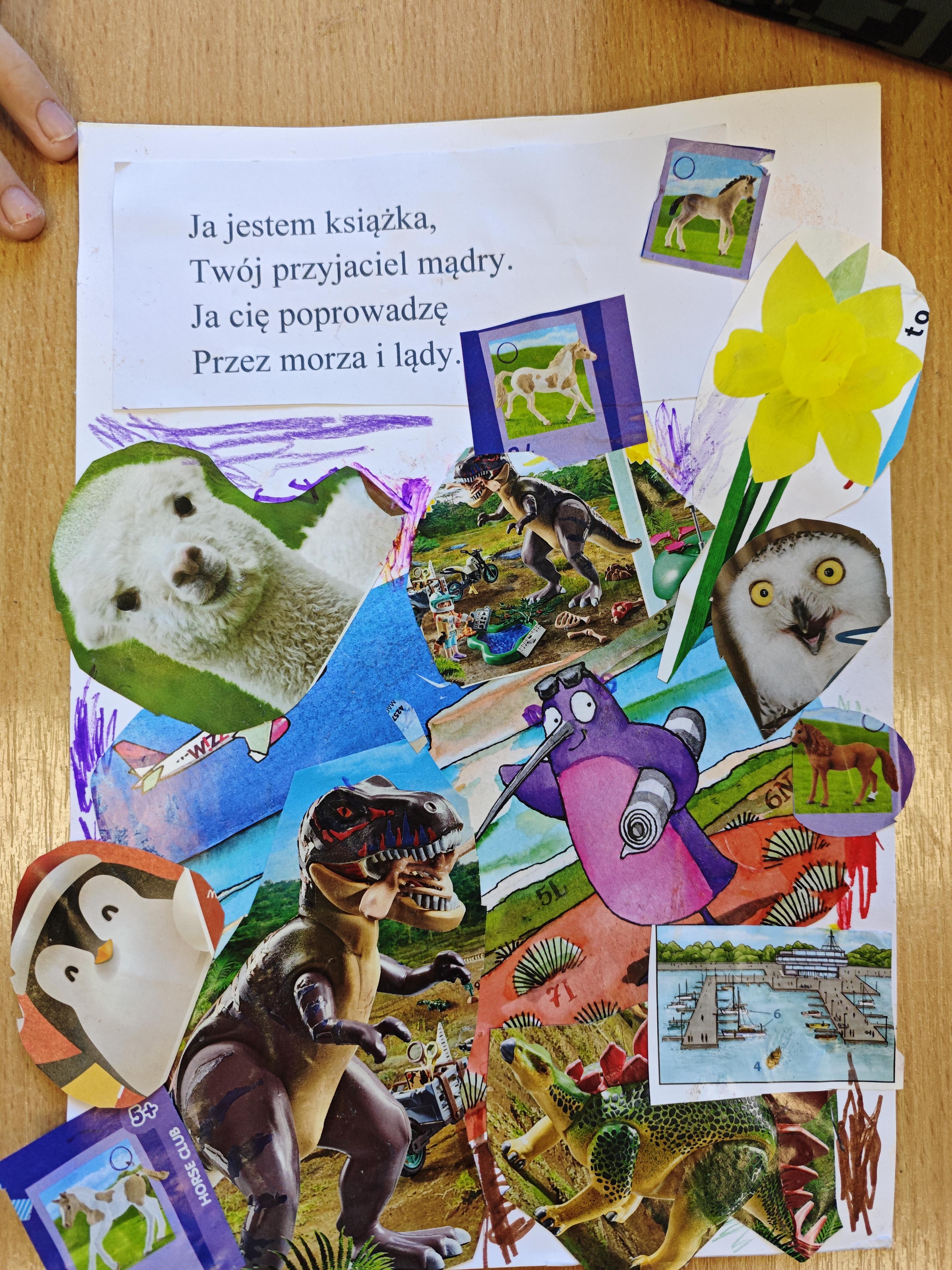 Jednym z najbardziej kreatywnych działań było wspólne tworzenie kolażu inspirowanego wierszem „Ja jestem książka”. Uczniowie, korzystając z wycinków z gazet i własnych rysunków, stworzyli unikalne prace, które oddawały ducha tego utworu.