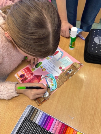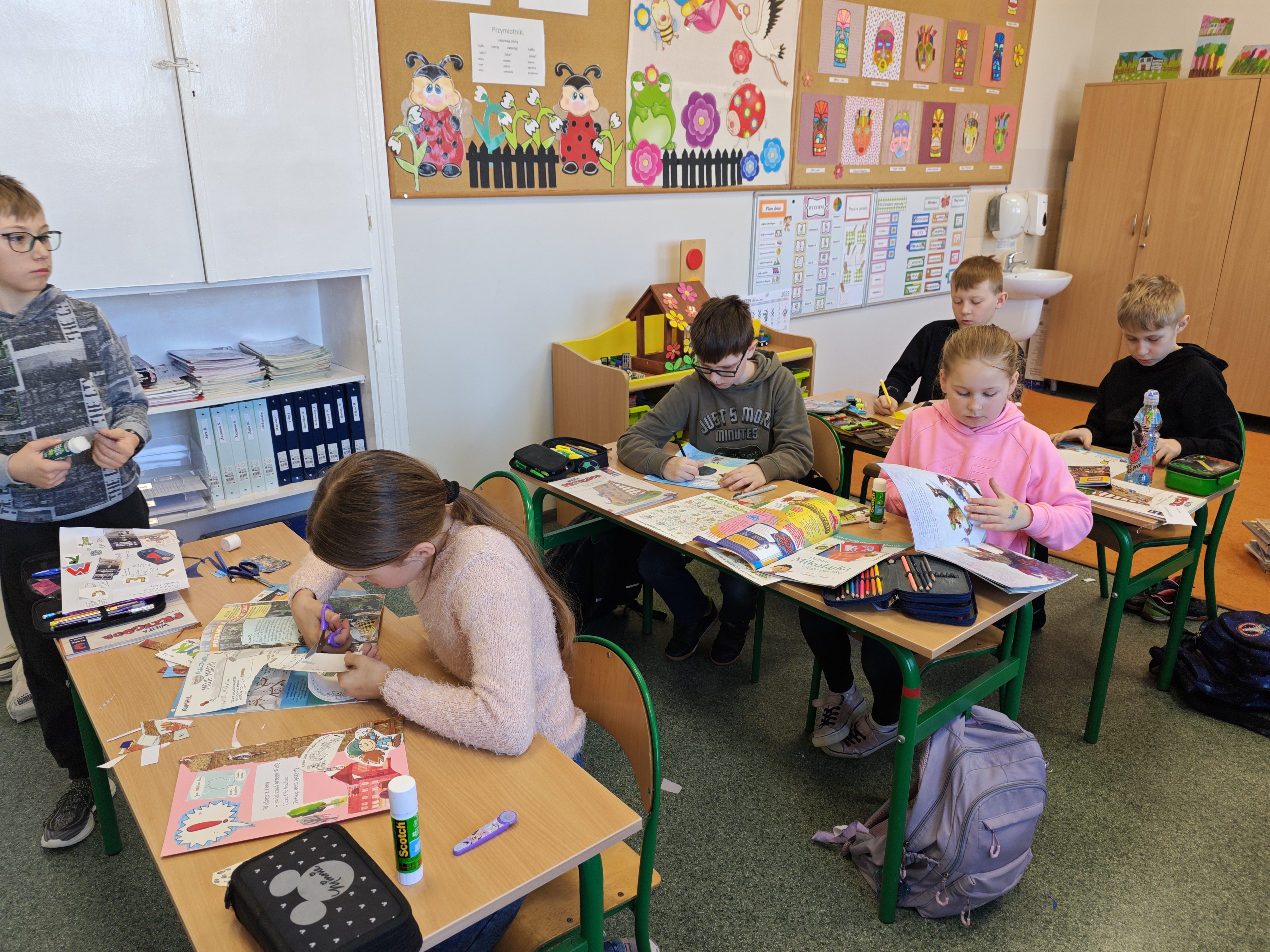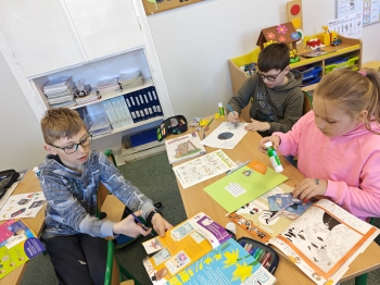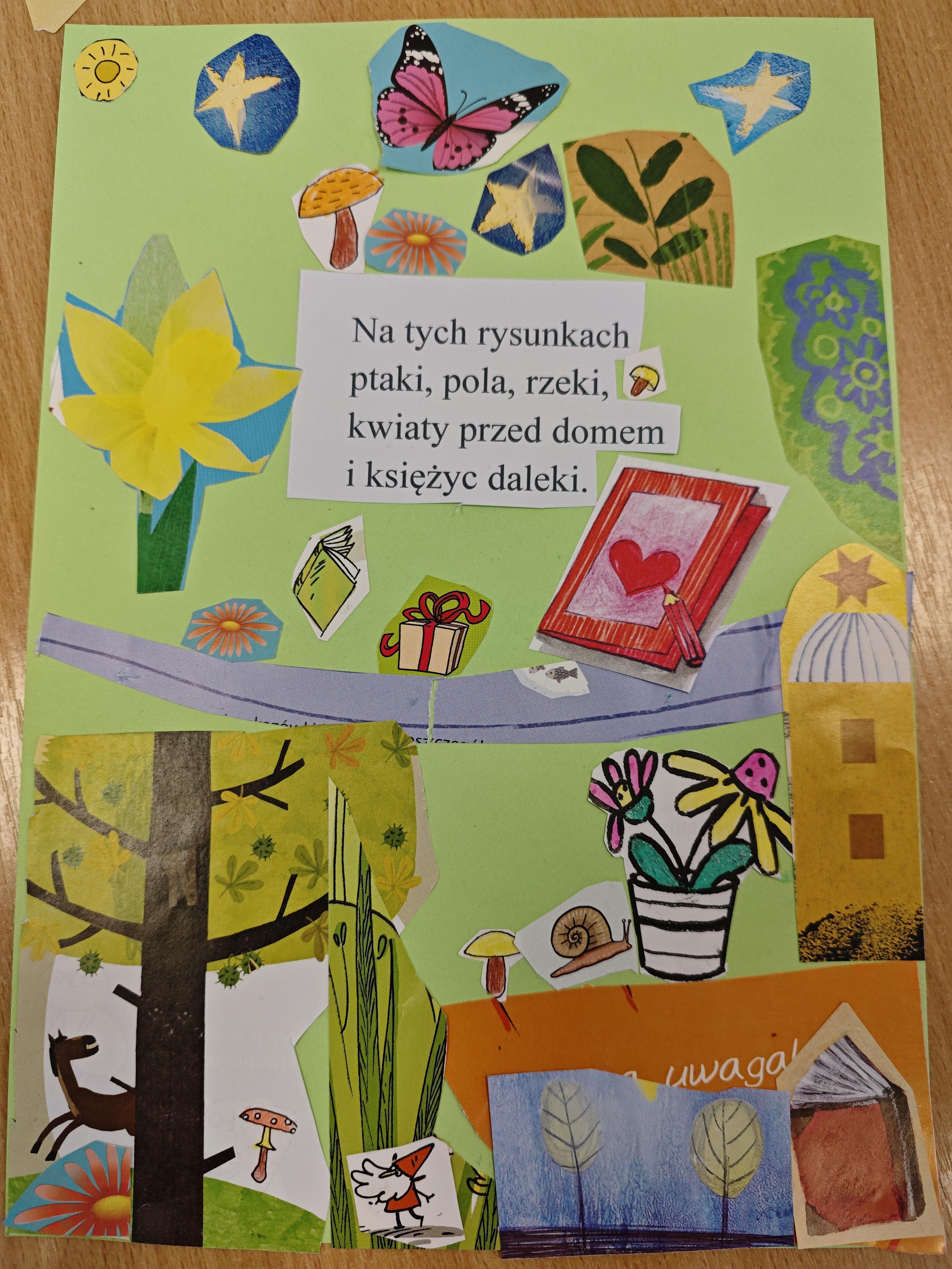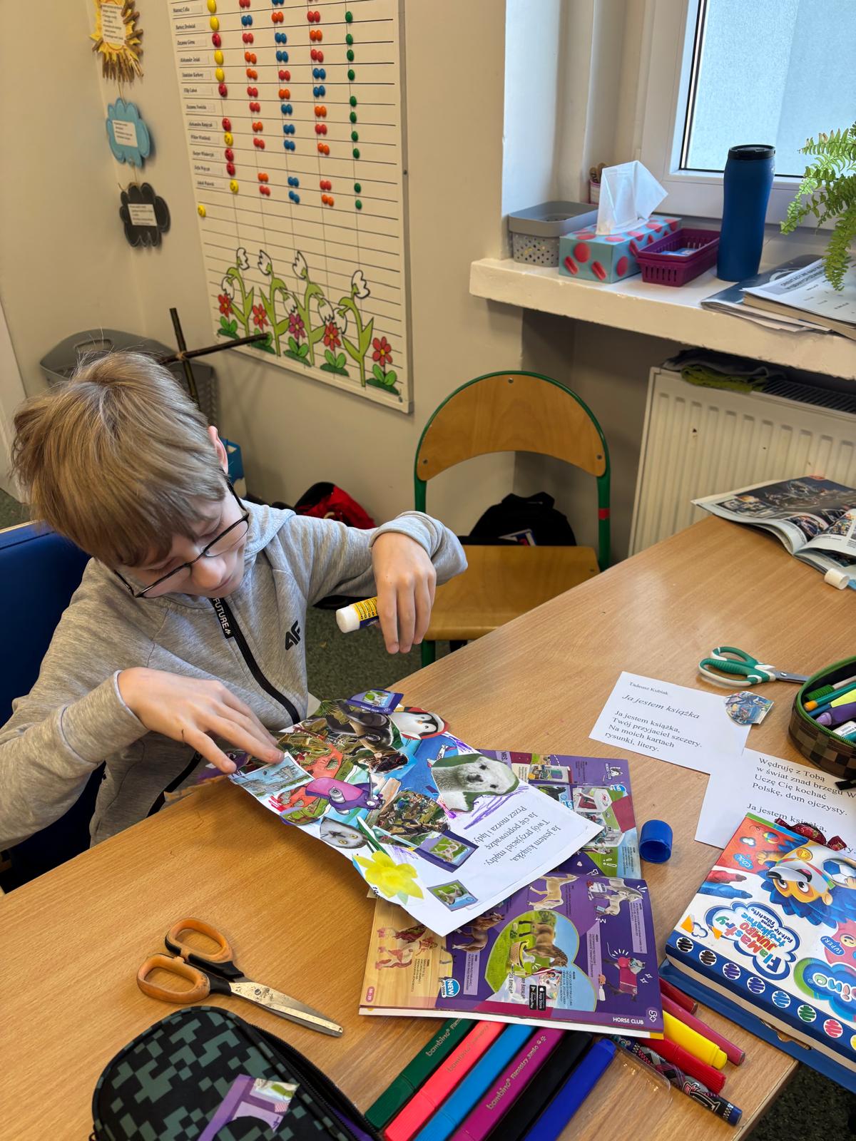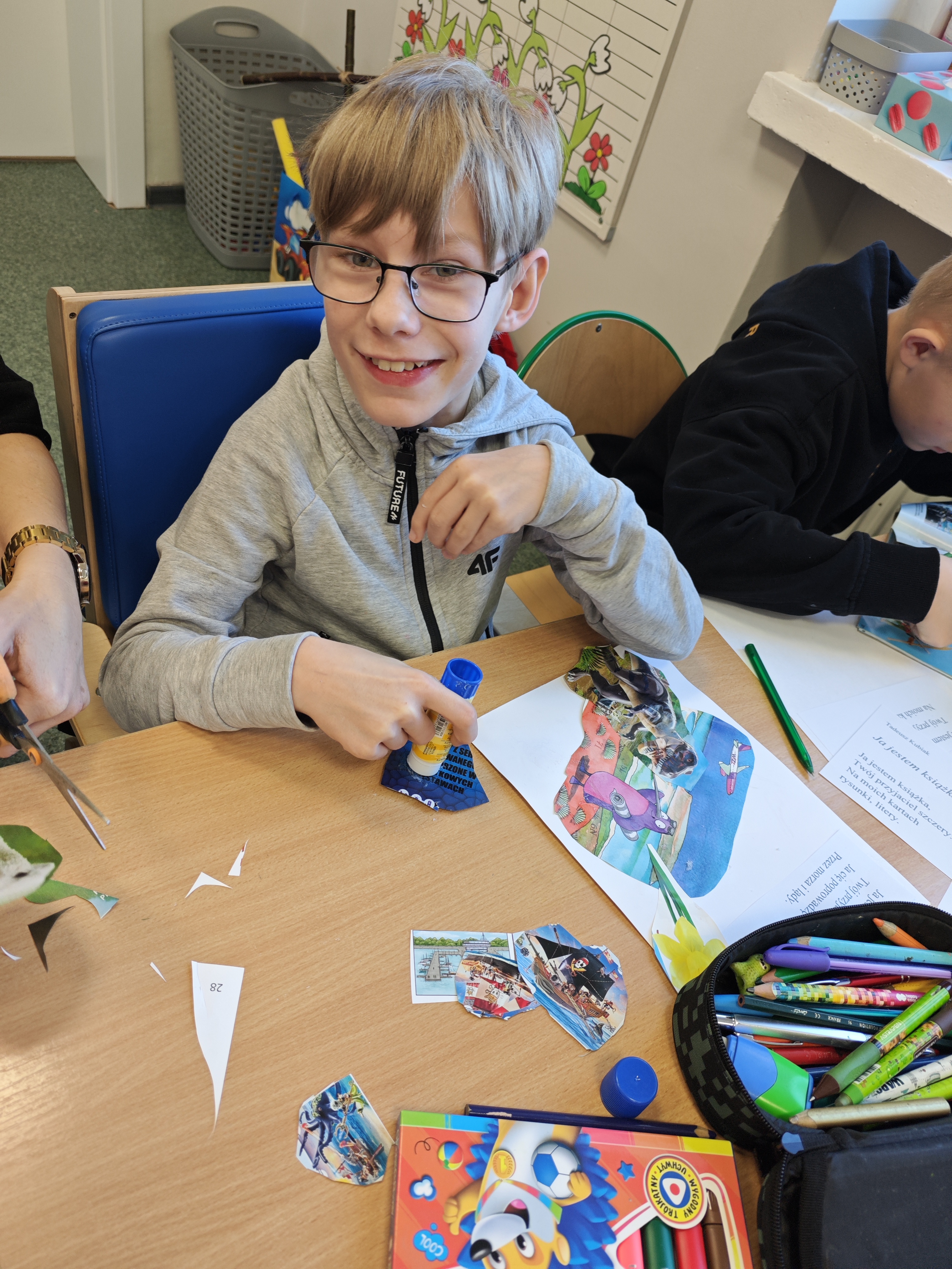 Jednym z najbardziej kreatywnych działań było wspólne tworzenie kolażu inspirowanego wierszem „Ja jestem książka”. Uczniowie, korzystając z wycinków z gazet i własnych rysunków, stworzyli unikalne prace, które oddawały ducha tego utworu.