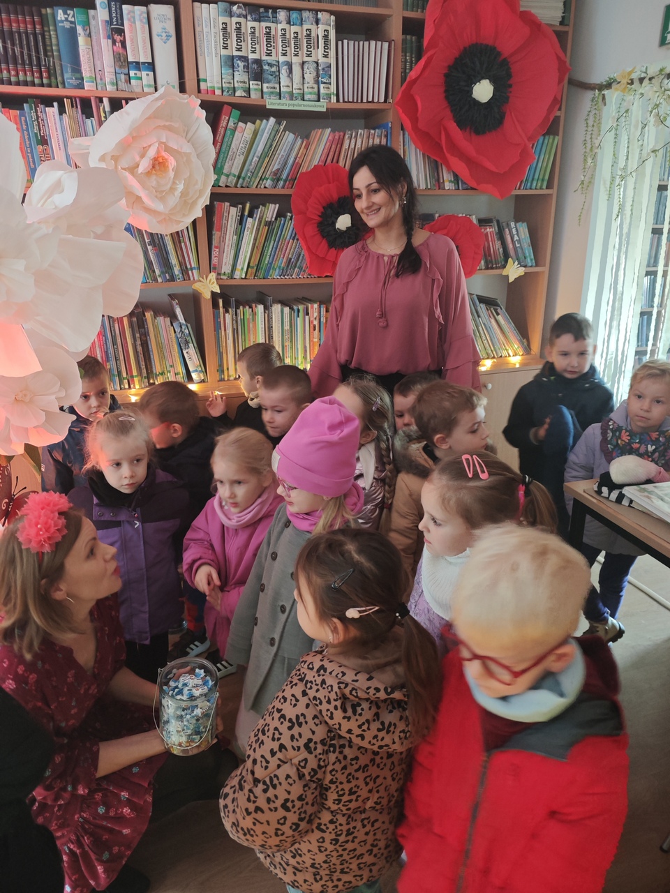 Imieniny po raz kolejny obchodzono wspólnie z Filią Biblioteczną, co dodatkowo podkreśliło wyjątkowy, integrujący charakter wydarzenia. W ciągu dwóch dni bibliotekę odwiedziło blisko 300 osób – uczniów, przedszkolaków nauczycieli, pracowników szkoły, którzy chętnie fotografowali się w wyjątkowej i magicznej scenerii.