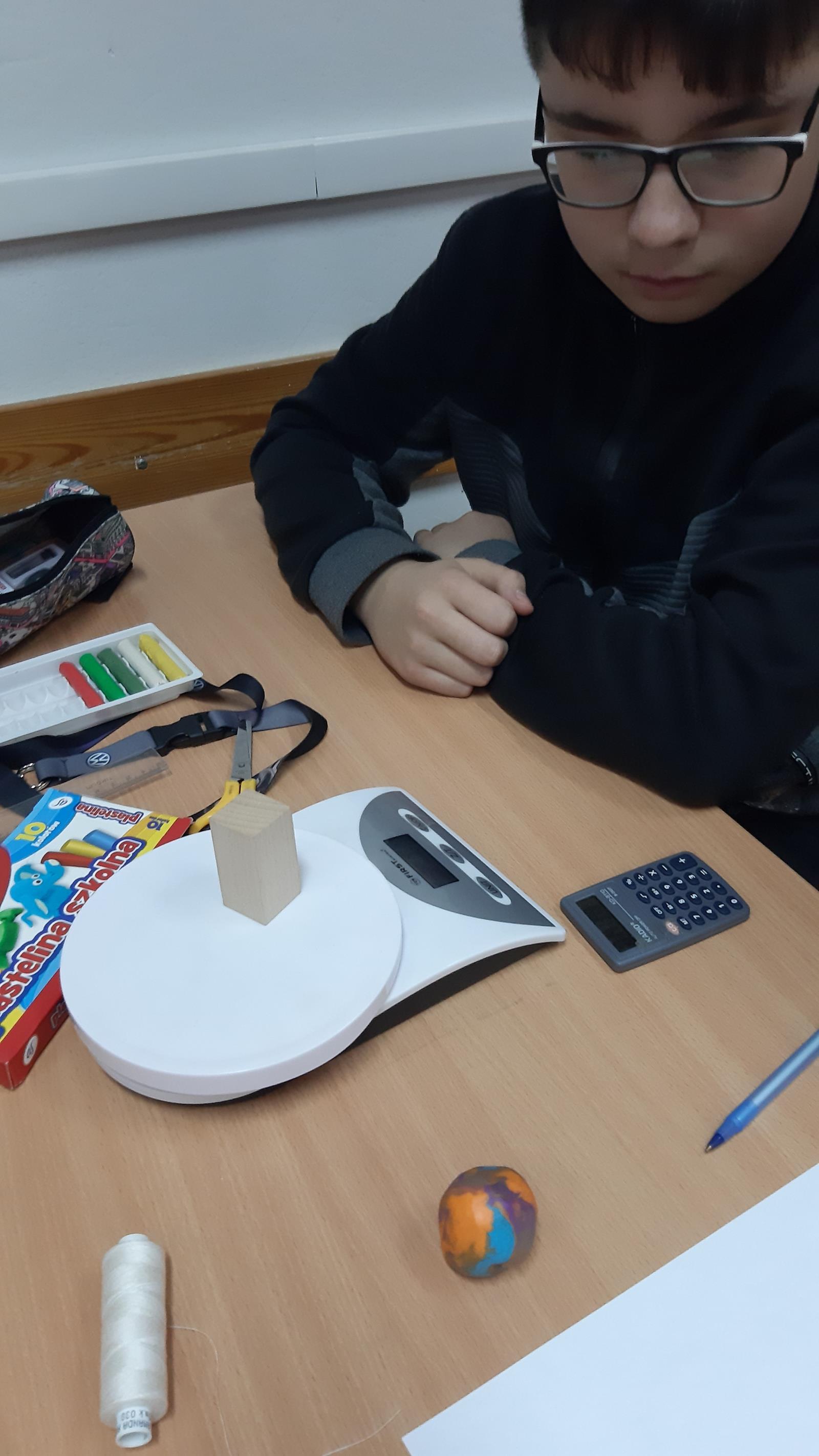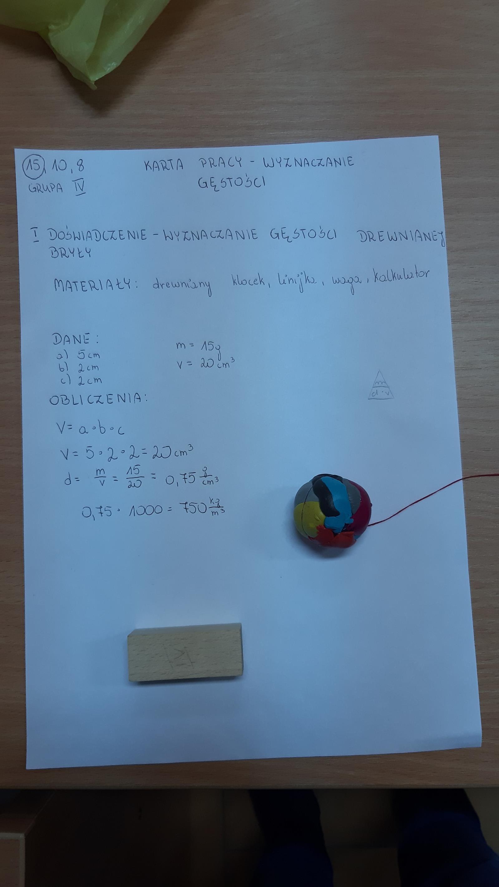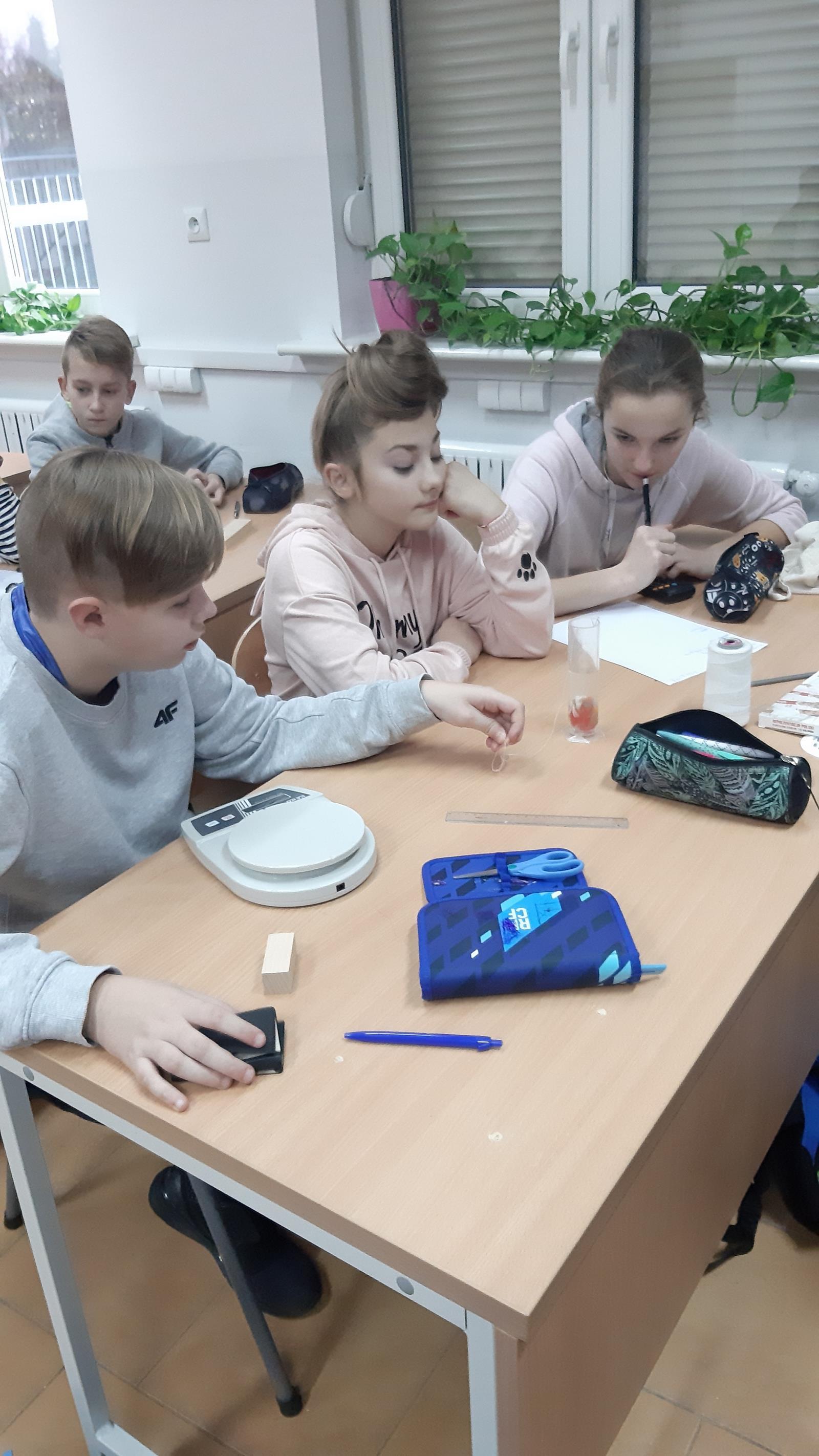 Na jednej z listopadowych lekcji fizyki wyznaczaliśmy gęstość ciał stałych: drewnianego klocka i plasteliny. Wykorzystaliśmy różne przyrządy miernicze i obliczeniowe: waga elektroniczna, cylinder miarowy, linijka, kalkulator. Każde doświadczenie opisaliśmy na kartach pracy podając dane, obliczenia oraz zamianę jednostek gęstości. Dzięki tym doświadczeniom mogliśmy łatwiej zrozumieć zagadnienia przedstawione na lekcjach. Oto krótka fotorelacja z naszych dokonań